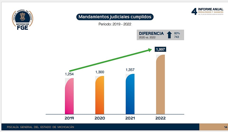 Del 2021 al 2022, la Fiscalía General de Justicia de Michoacán (FGE) elevó el número de mandatos judiciales cumplimentados, según cifras del fiscal Adrián López Solís.