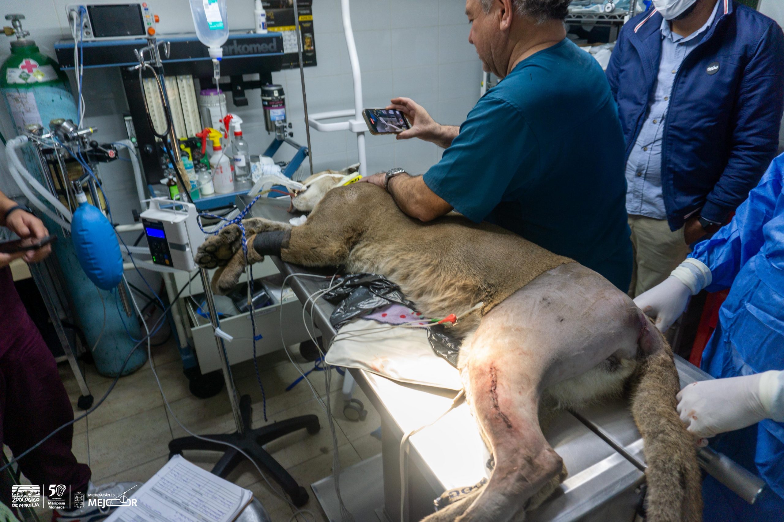 El ejemplar fue trasladado al zoológico en estado crítico y durante la noche fue sometido a una compleja cirugía ortopédica para intentar salvarle la vida. La intervención, en la que participaron especialistas en ortopedia animal, incluyó la colocación de placas de titanio y clavos en sus extremidades; sin embargo, la salud del felino permaneció grave durante toda la noche del miércoles y la mañana de este día.