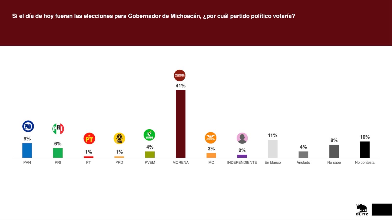 En la encuesta resalta también que Morena encabeza las preferencias electorales con el 41 %, más de 30 puntos porcentuales de su más cercano competidor.