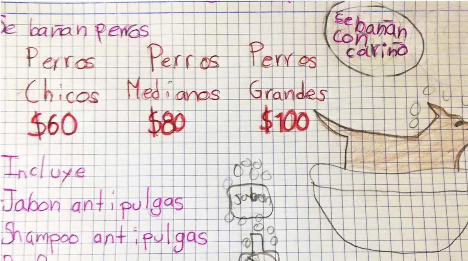 Un niño tiene el sueño de convertirse en un futuro en médico veterinario, por lo que de una vez comenzará a juntar dinero para pagar la carrera; para lograrlo, a sus siete años inició un negocio en el que “baña a perritos con mucho amor”. La orgullosa madre compartió en redes sociales el cartel con los servicios que ofrece su hijo.